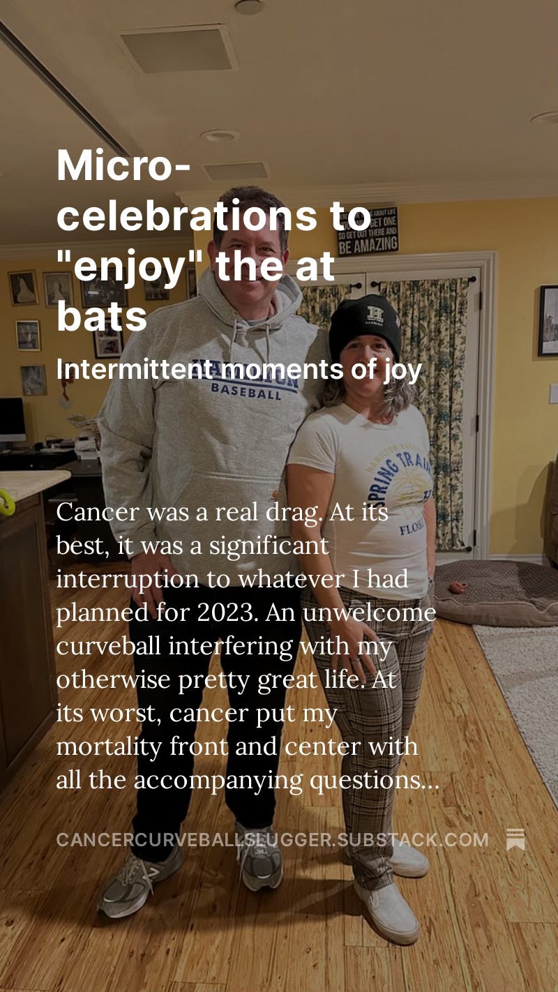 I know it was a game I played with my mind, but it felt a lot better than wondering if the labs would be good or if I would feel sick or tired after chemo. Whatever makes you feel better in the batter's box is worth taking up to the plate.