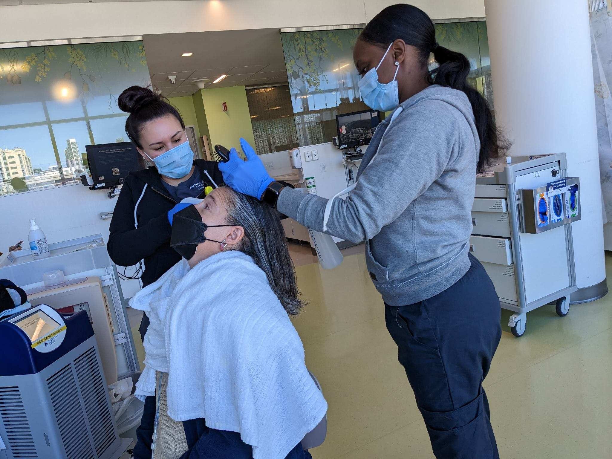 There are three Dignicap seats in UCSF's three Dignicap-enabled infusion centers. After ensuring that the cap connects and cools with the machine, the Medical Assistant has to wet your scalp entirely. My mother and I were in a corner of the infusion center, and the MA walked over with a stool and a spray bottle, saying it's time to wet your hair. One of the things about me is that I have a massive amount of hair. It's dense and dries quickly. My hair stylist has been cutting and styling my hair for 15 or more years and, every time, comments on how much hair I have to work with. Before starting treatment, I asked a friend who is a talented professional photographer if he would photograph my hair. I really wanted Dignicap to work.