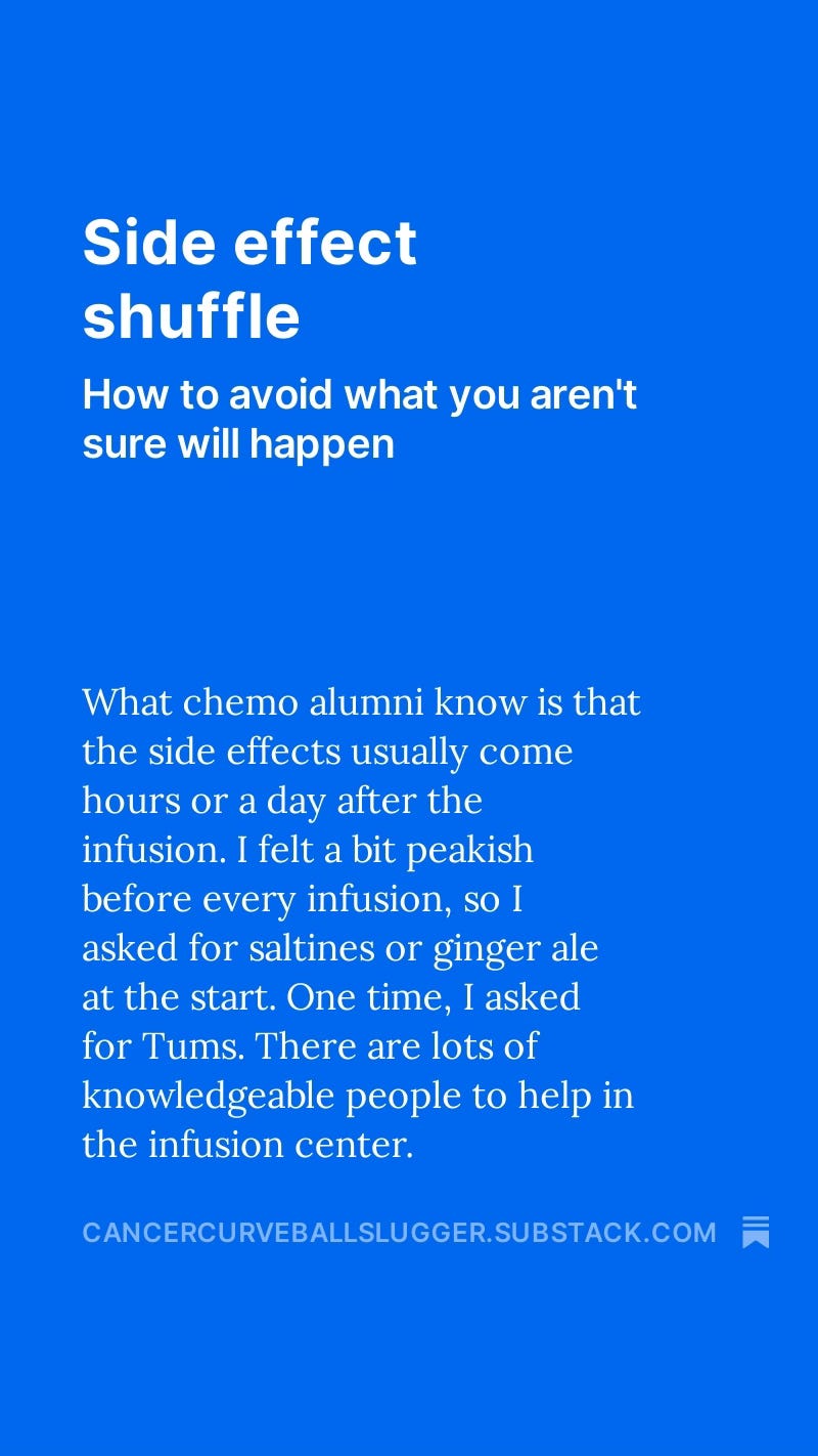 Chemo is cumulative. The most apparent indication of the accumulation is hair loss, which starts between infusions 2 and 3. For people who cannot or do not use cold capping (it's an extra cost, and insurance is very, very difficult about it - inexplicably in comparison to the total costs of cancer treatment). Fatigue accumulates because the chemo attacks your body systemically - which is good because that's how it finds roaming cancer cells and destroys them - but that impacts you with potential anemia. Immunotherapy can affect your thyroid, making you even more tired. So it accumulates. But until my first infusion, I had no idea what to expect. Hollywood, books, and personal history combined to make me very concerned about what would happen if I exposed my body to this helpful poison.