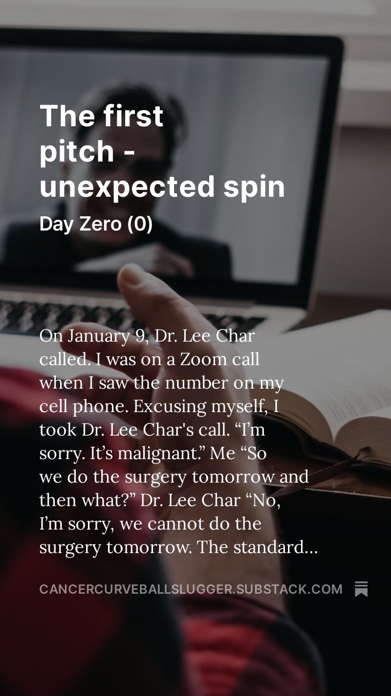 I stepped into the batter's box, sized up the spin, speed, and trajectory of this unexpected pitch, gathered information, marshaled my strengths, and swung at the pitch. I advocated and pushed the timeline because there are 3 surgeons, 3 fellows (also surgeons), anesthesiology, and people traveling to support me - moving my surgery from January 10 was a lot of hassle. In fact, I told the scheduler that I was not prepared to move the surgery that would remove the tumor IF there actually was a tumor. If the doctors needed to know in advance if the suspicious mass was cancer, they were going to have to adjust to my schedule. So they did. Somehow, they found an 8am appointment on January 5.