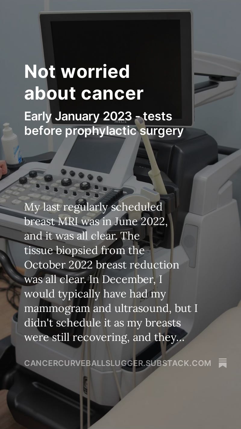 My experience began to change in late 2021 when my doctors saw a suspicious mass and did an MRI-guided biopsy. In the week between the biopsy and the pathology report, I found myself facing a cancer curveball pitch as I unwillingly stepped into the batter's box, waiting to see if life's pitcher released that ball with the telltale topspin of a curve. Tracey and I discussed my uncertainty and my thoughts about whether it was worth the time to consult with a plastic surgeon. Tracey thought it would be helpful, informative, and anxiety-reducing. She offered to join me for the appointment.