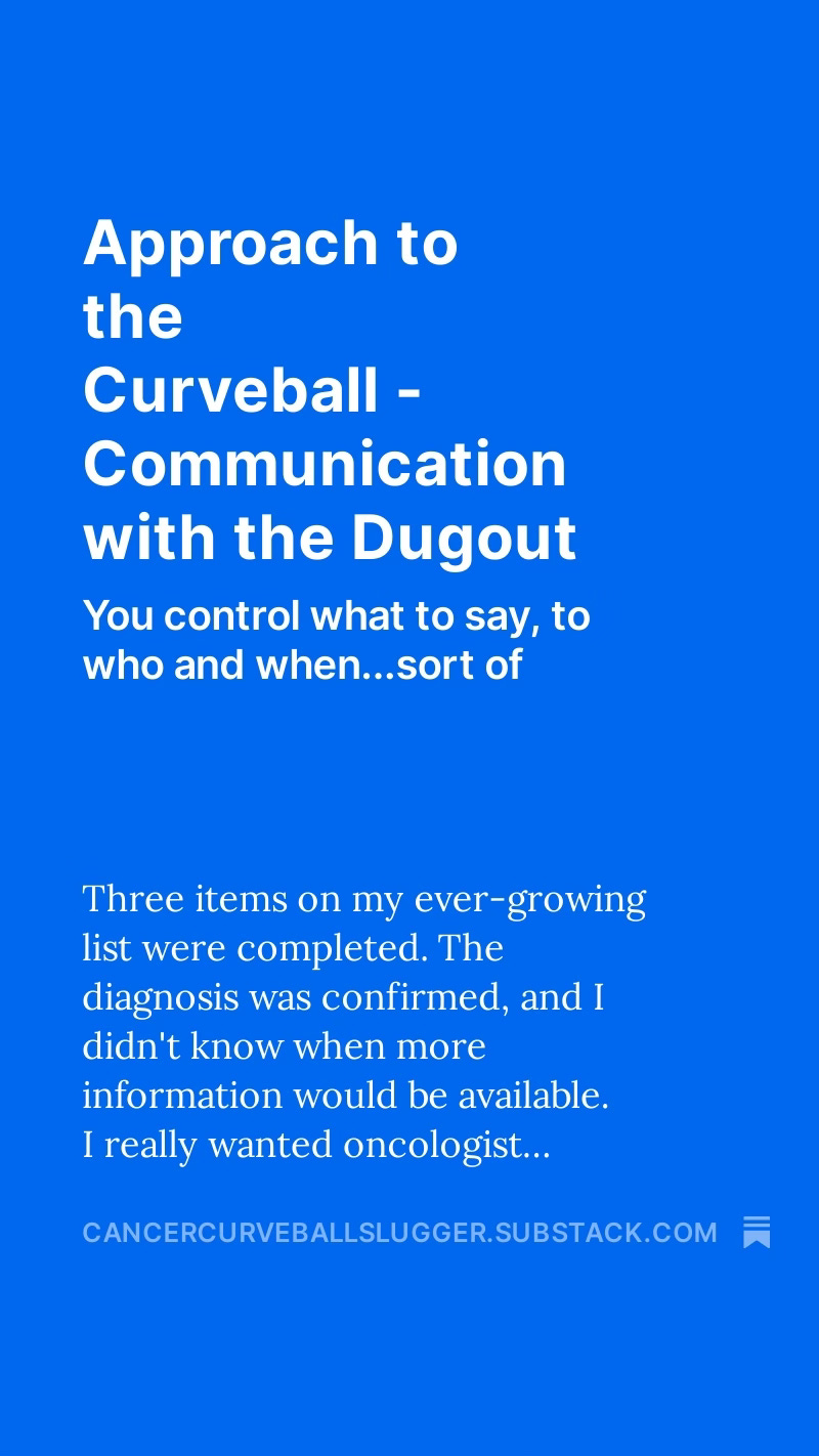 I was not going to approach these curveball pitches alone like my parents had felt 40+ years prior - my "at bat" was going to have a lot of people in the dugout and cheering from the sidelines. Because of the now-canceled surgery, many people were about to be in the grandstand for my treatment, and I was going to need to be clear about what I did and did not want - before I fully knew. That's part of being in the batter's box.