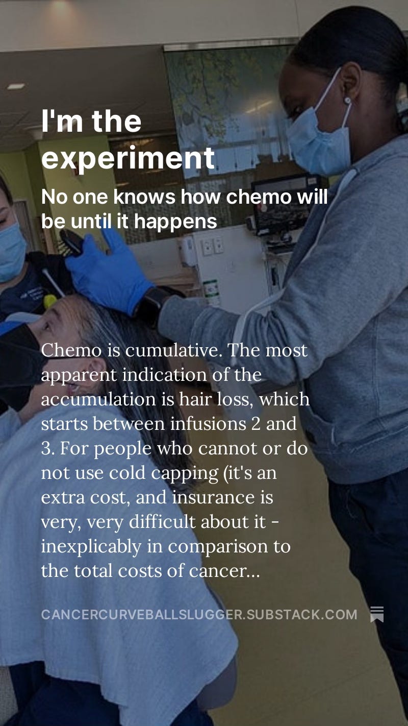 More waiting. And during the waiting, it is very, very hard to focus on anything other than "I have cancer, and it's still growing inside me." From Dr. Chien to the first treatment, I waited two weeks. The wait was a combination of a second pathology review, port placement (which can be done concurrent with the first chemo, but I had two weeks, so no need), and securing a seat with Dignicap machine in a UCSF infusion center - weekly on Tuesdays or Wednesdays so that my infusions were the same days as Dr. Chien's clinic - preventing additional trips to the hospital. By the way, that was Dr. Chien's idea, and it was excellent. Combined with my minimal side effects, I was able to box cancer into one day a week most weeks.