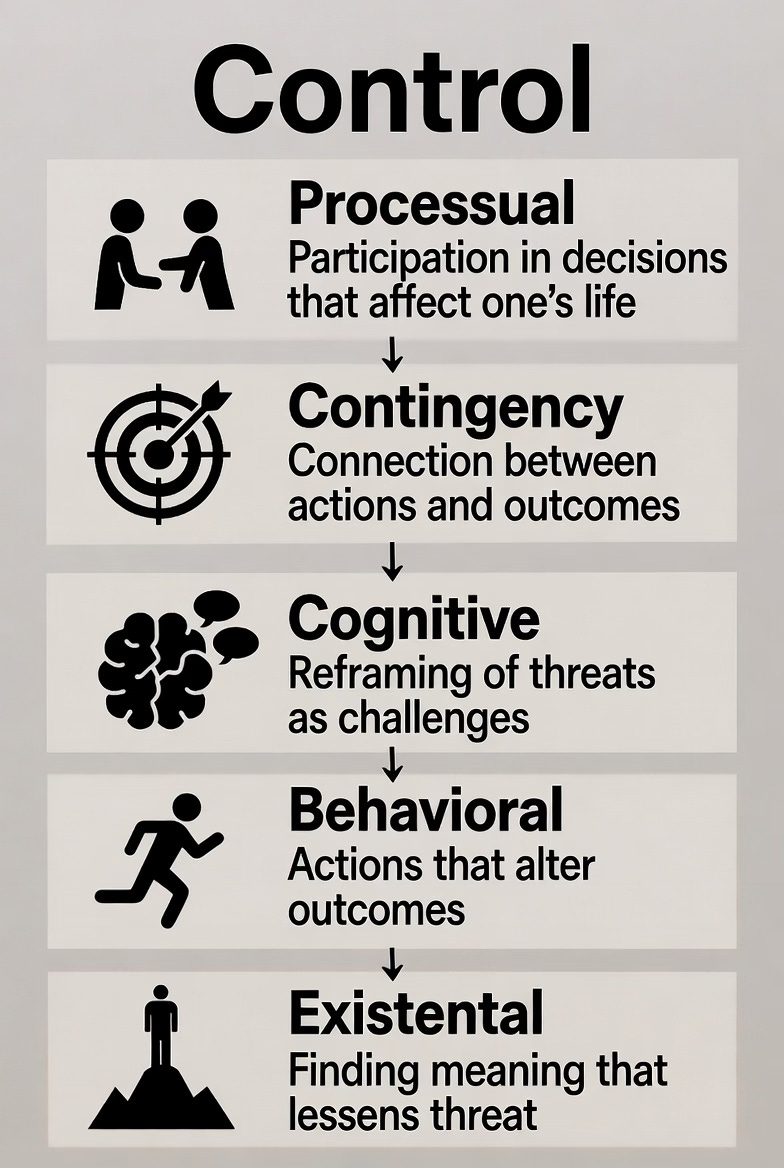 Research on cancer patients identifies five types of control: processual (participation in decisions), contingency (connection between actions and outcomes), cognitive (reframing threats), behavioral (actions that alter outcomes), and existential (finding meaning that lessens threat).